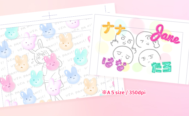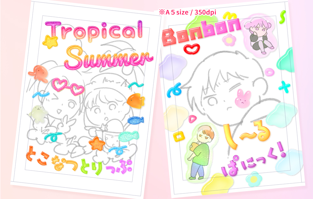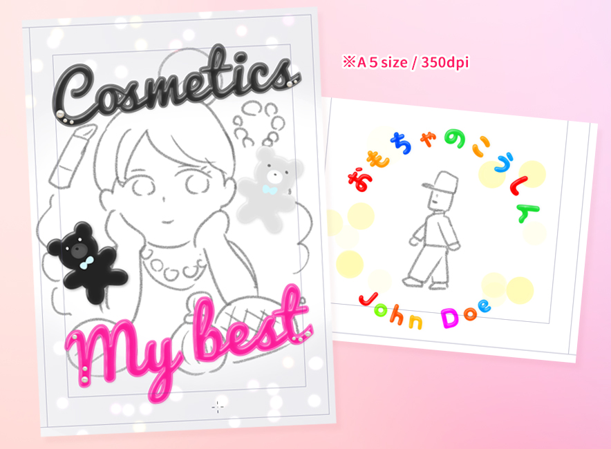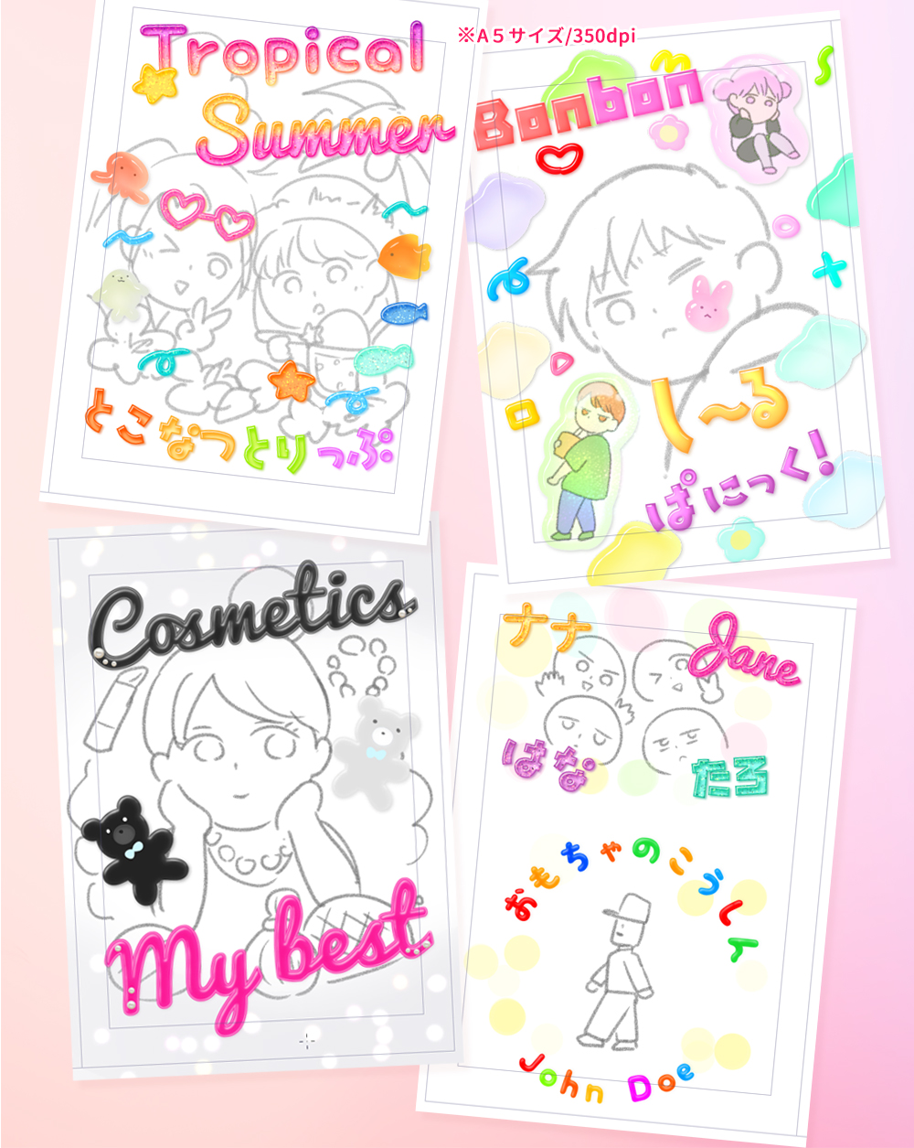 テキスト、手書き文字&イラストを組み合わせることで、ポップな雰囲気の表紙イラスト&ミニイラストが作成できます♪