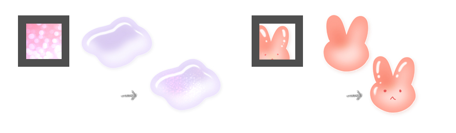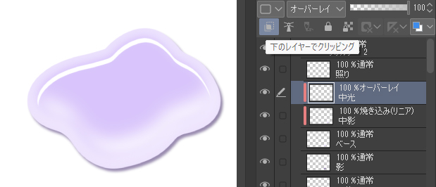 好みの位置に移動させた時、シール(ベース)からはみ出ることのないように、「中光」「中影」レイヤー双方、ベースとなったレイヤーにクリッピングさせておきましょう。