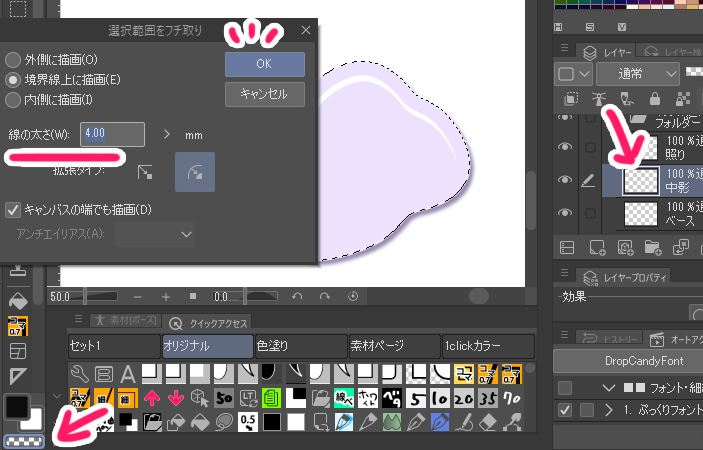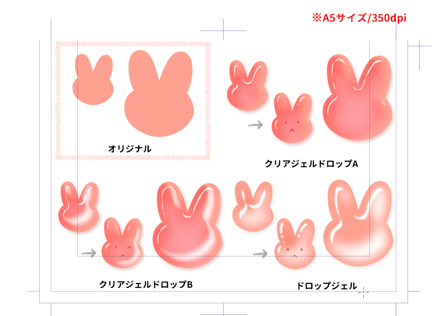 クリスタのオートアクションを用いて「ぷっくりドロップスタイル」を適用する場合、対象とするイラストは、最初に設定したサイズと同じくらいのものでないと、同じようにキレイな形にはなりません。