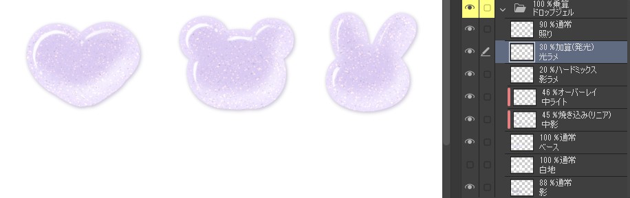 ラメ用のブラシや、エアブラシを用いて散布し、レイヤーの合成モードを「加算(発光)」や「ハードミックス」などにして組み合わせることで、リアルなラメ入りのドロップシールスタイルを演出できます♪