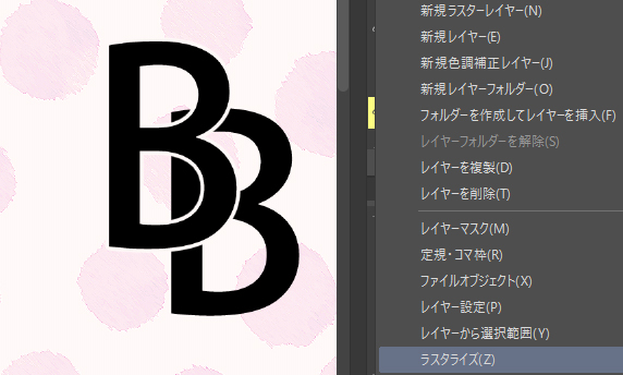 テキストを利用する場合は、ラスタライズしてテキストレイヤーからラスターレイヤーへ変更しておきましょう。