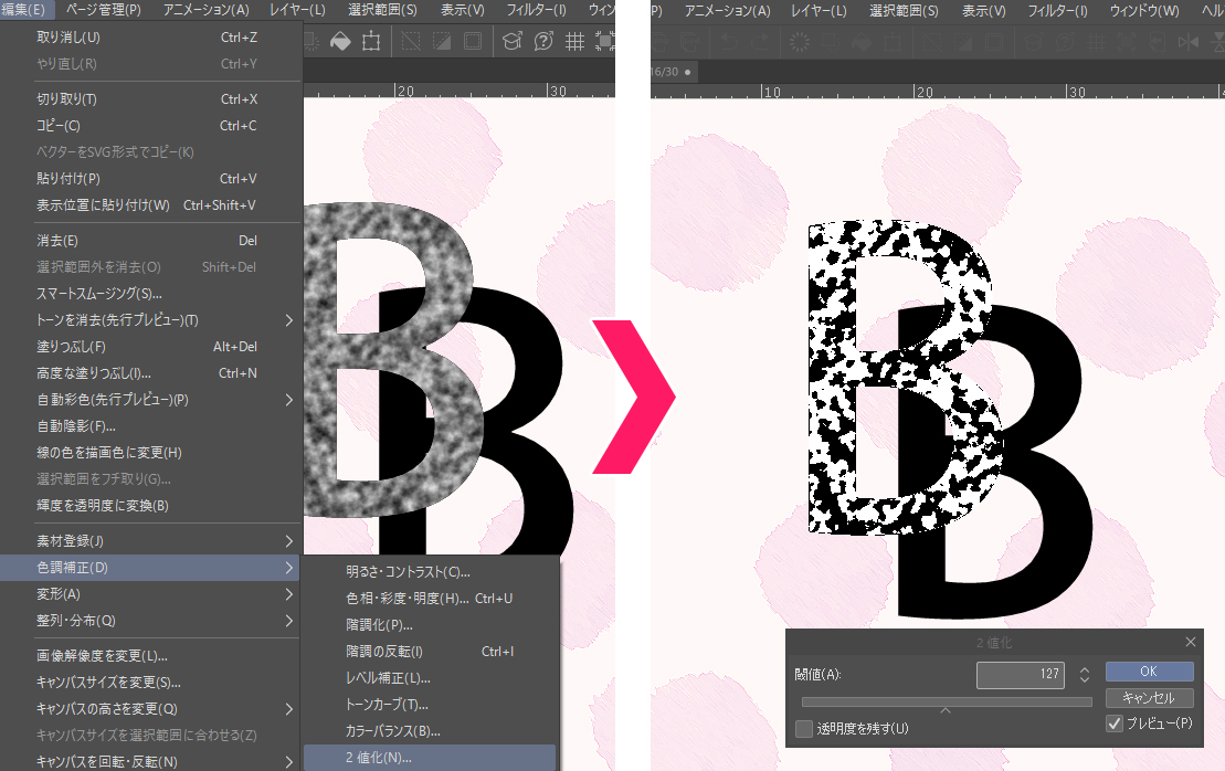 ③「編集 - 色調補正 - 2値化」